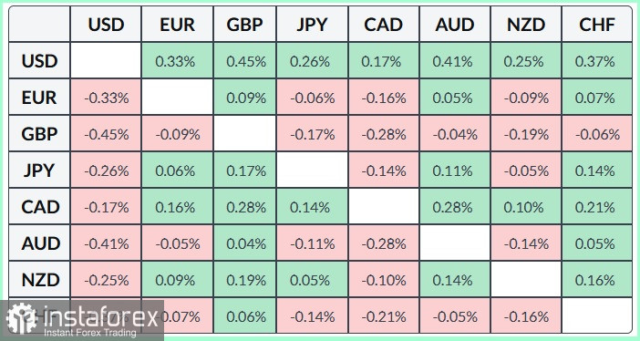يوضح الجدول أدناه نسبة التغير في أداء الدولار الأمريكي مقابل العملات الرئيسية خلال تداولات اليوم. وقد سجّل الدولار الأمريكي أقوى أداء أمام الجنيه الإسترليني.