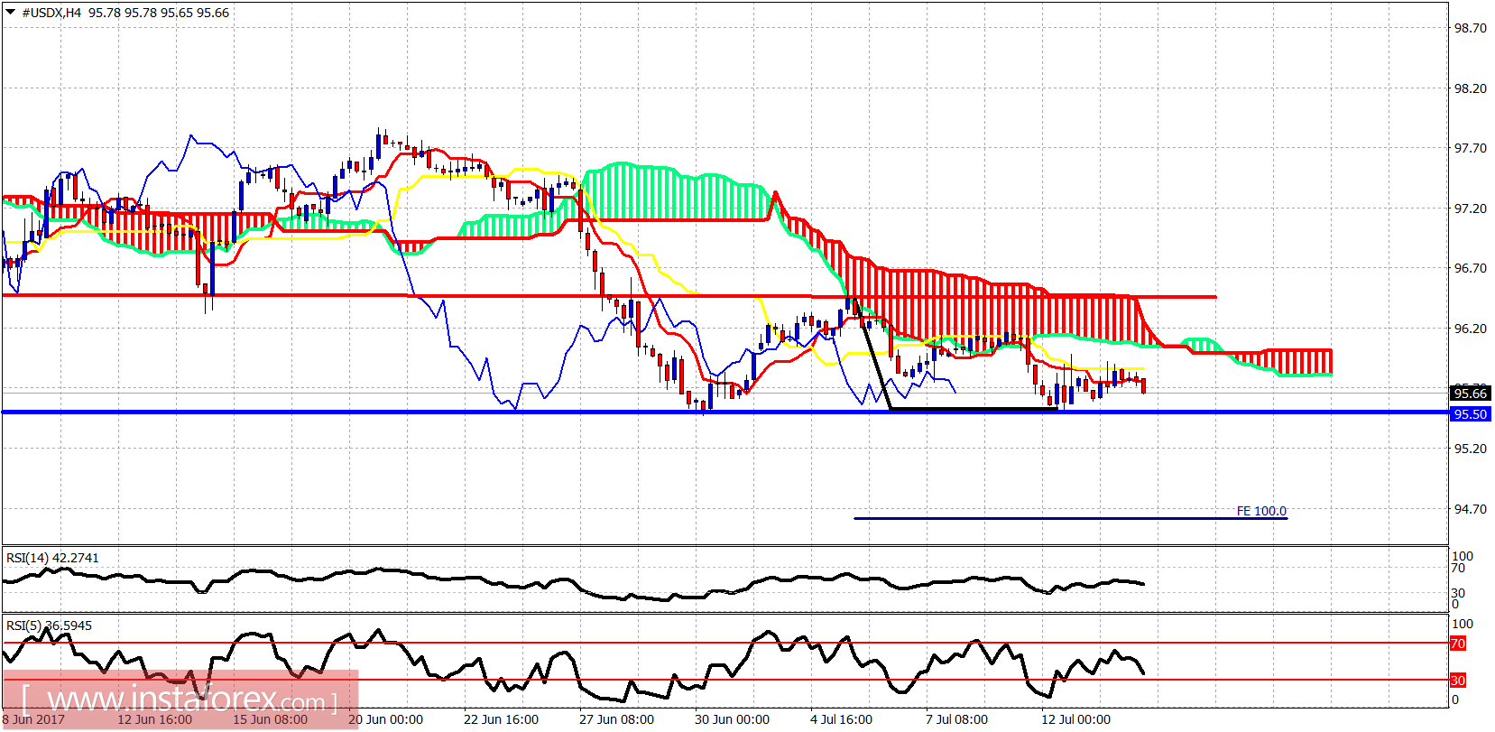 14.07.2017 09:10 AMThe Dollar index remains above the recent lows at 95.50 although the chances of breaking the lows are high. The trend remains bearish. Breaking below 95.50 will open the way for a move towards 94.70.