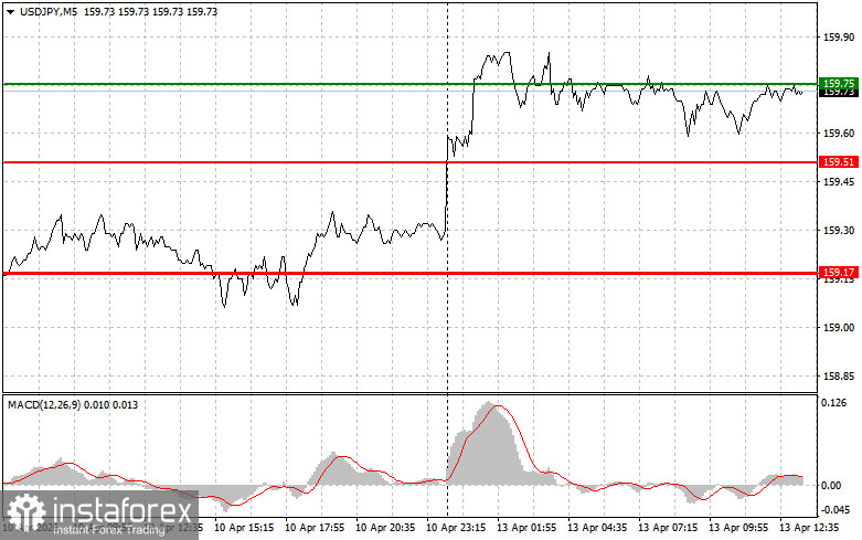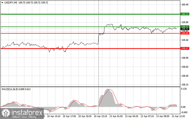 Сценарий №2: покупать USD/JPY сегодня также планирую в случае двух подряд тестов цены 159.59 в момент, когда индикатор MACD будет находиться в области перепроданности. Это ограничит нисходящий потенциал пары и приведет к обратному развороту рынка вверх. Можно ожидать рост к противоположным уровням 159.77 и 160.13.