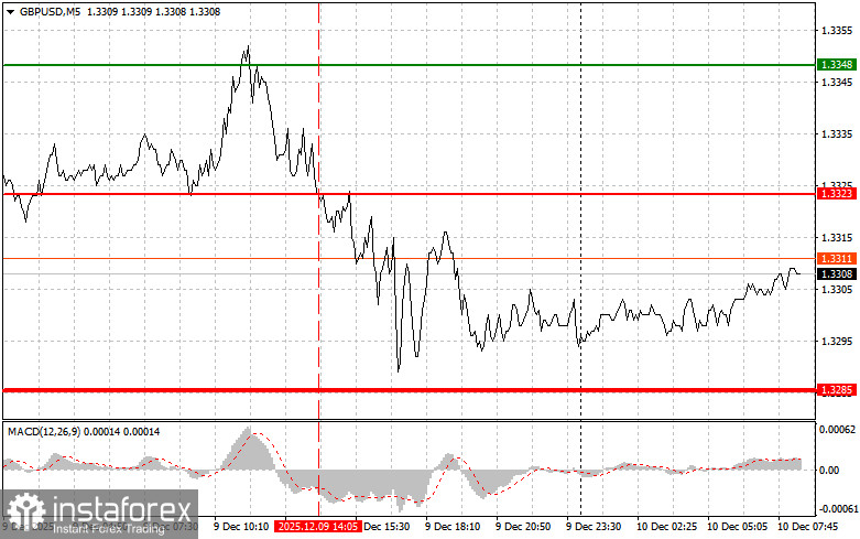 Первый тест цены 1.3323 пришелся на момент, когда индикатор MACD много прошел вниз от нулевой отметки, что ограничивало нисходящий потенциал пары. По этой причине я не продавал фунт.