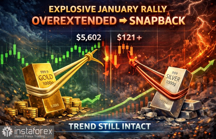 31.01.2026 21:31После январского взрывного ралли распродажа золота и серебра оказалась неизбежной, хотя общий восходящий тренд сохраняется нетронутым. Подобный сценарий не стал неожиданностью, учитывая значительную переоцененность обоих драгоценных металлов.