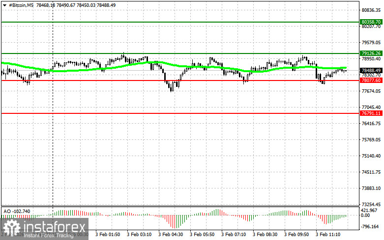 Сценарий №2: покупать биткоин можно от нижней границы $78 000 при отсутствии рыночной реакции на ее пробой в обратную сторону к уровням $79 100 и $80 300.