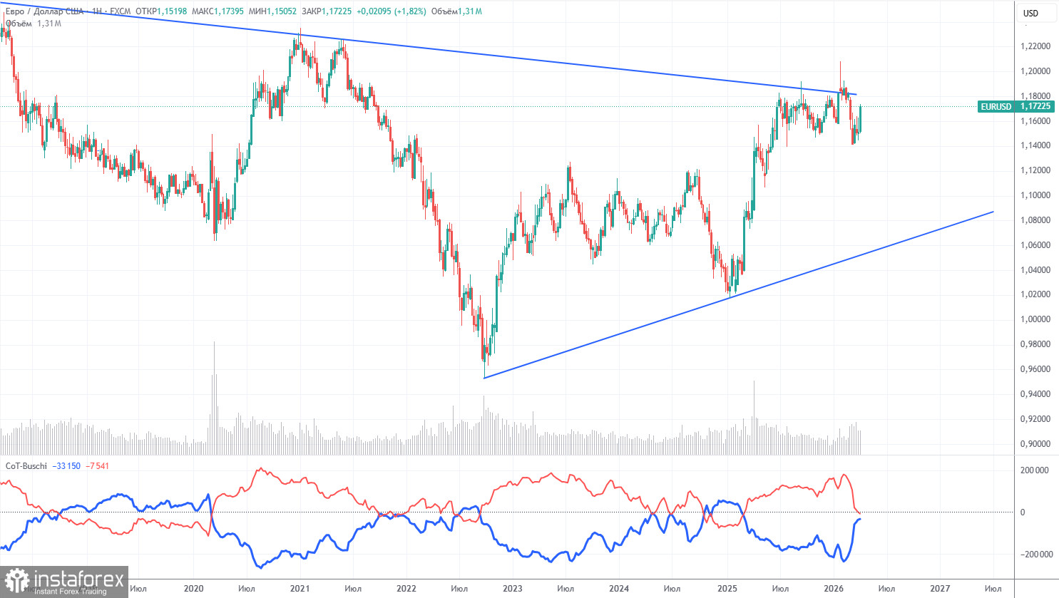 В техническом плане на часовом ТФ продолжает формирование новая восходящая тенденция. Однако все трейдеры отлично понимают: если переговоры провалятся, война продолжится, а Ормузский пролив останется заблокированным, то спрос на доллар может вновь начать расти. Мы уверены, что геополитика не будет оказывать благоприятное влияние на доллар еще, к примеру, полгода, но определить момент, когда она окончательно отойдет на второй план тоже крайне сложно. Поэтому закрывать глаза на геополитику в ближайшее время пока не стоит.