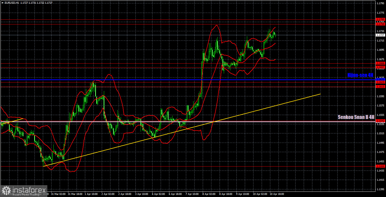 Валютная пара EUR/USD в пятницу продолжала восходящее движение, что является ключевым моментом. Напомним, что на прошлой неделе ситуация на Ближнем Востоке неожиданно начала меняться в лучшую сторону, однако на текущий момент все еще неясно, будет ли достигнут мир? Иран, Израиль и США договорились о двухнедельном прекращении огня и разблокировке Ормузского пролива в среду ночью, но уже в среду днем Израиль обстрелял Ливан, а Иран с удовольствием запустил ракеты по Бахрейну и Кувейту. Что касается Ормузского пролива, то он остается заблокированным. Таким образом, дым есть, а огня не видно. Рынок же посчитал, что мифическое перемирие и будущие переговоры – это гораздо лучше, чем военные действия, поэтому начал избавляться от американской валюты, как от безопасного актива. И в пятницу ситуация на валютном рынке не изменилась, что очень важно.
