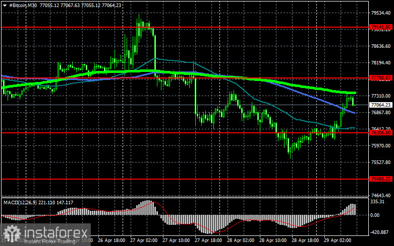 Что касается технической картины Bitcoin, то покупатели сейчас нацелены на возврат уровня $77 700, который открывает прямую дорогу на $79 100, а там уже и рукой подать до уровня 80 900. Самой дальней целью выступит максимум в районе $83 100, преодоление которого будет означать попытки возврата бычьего рынка. В случае падения биткоина покупателей жду на уровне $76 300. Возврат торгового инструмента под эту область может быстро свалить BTC в район $75 000. Самой дальней целью будет область $73 100.