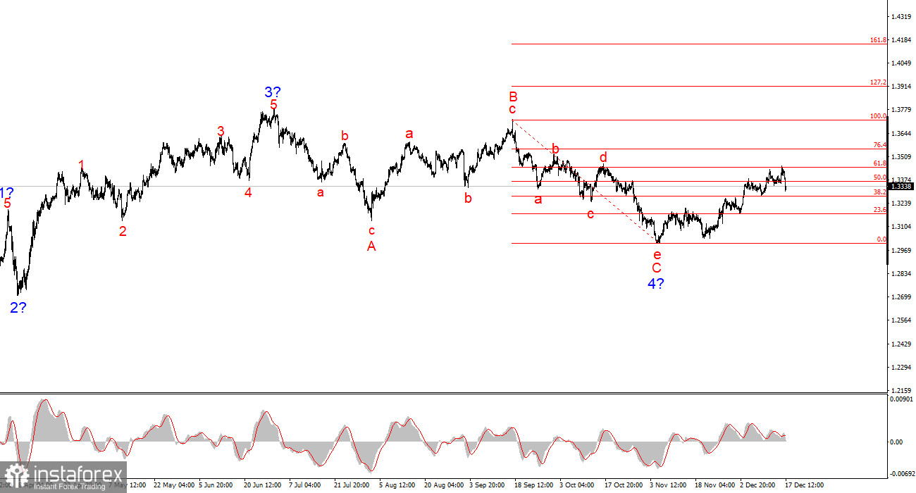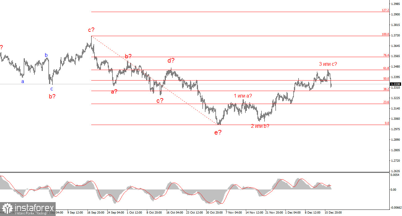По инструменту GBP/USD волновая разметка продолжает свидетельствовать о построении повышательного участка тренда(картинка снизу), но в последние полгода она приняла сложный и протяженный вид(картинка сверху). Участок тренда, берущий свое начало 1 июля, можно считать волной 4. Или же любой глобальной коррекционной волной, так как она абсолютно точно имеет коррекционную, а не импульсную внутреннюю волновую структуру. Тоже самое касается и ее внутренних подволн. Понижательная структура волн, берущая начало 17 сентября, приняла пятиволновой вид a-b-c-d-e и завершена. Сейчас инструмент находится в стадии построения нового повышательного набора волн.