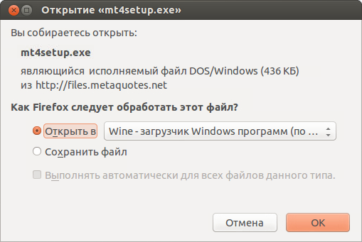 To install the terminal, download the installer mt4setup.exe. After the download is complete, launch the setup file. The system will automatically determine that you are trying to run a file designed for Microsoft Windows and will offer to open it with Wine. Select this option and click "OK".