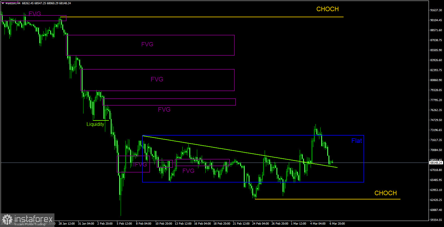 Биткоин продолжает формирование полноценного нисходящего тренда. Мы продолжаем ожидать падения с целью 57 500$(уровень 61,8% по Фибоначчи от трехлетнего восходящего тренда), а признаков разворота тренда в данное время ни одного. Но даже уровень 57 500$ теперь не выглядит, как конечная остановка. Из областей POI в данное время можно отметить только ближайший «медвежий» FVG на дневном ТФ, который располагается достаточно далеко от цены. На 4-часовом ТФ была сформирована девиация верхней границы бокового канала с подтверждением на M30, поэтому биткоин в ближайшее время может опуститься к 65 100$.