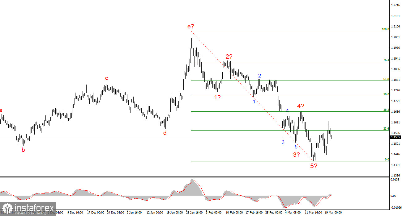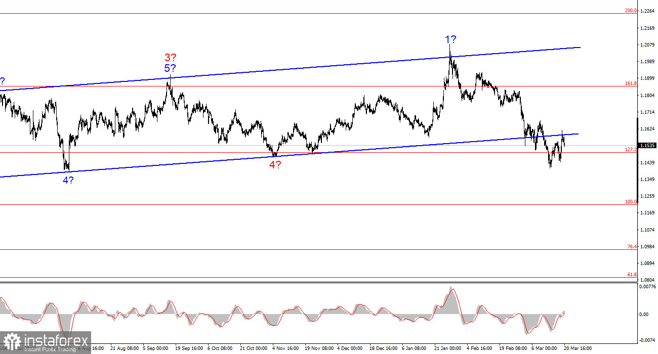 На картинке выше я могу выделить классическую пятиволновую импульсную структуру волн с удлинением в третьей волне. Если это действительно так, то построение этой структуры завершено, а нас ожидает построение коррекционного набора минимум на три волны. Следовательно, в ближайшее время стоит ожидать повышения котировок инструмента, но уже в рамках коррекции относительно последнего участка тренда. Пока что последние волновые структуры очень плохо вписываются в старшую разметку, но со временем ситуация должна проясниться. В ближайшее время можно ожидать восстановления европейской валюты к отметкам 1,1568 и 1,1666.