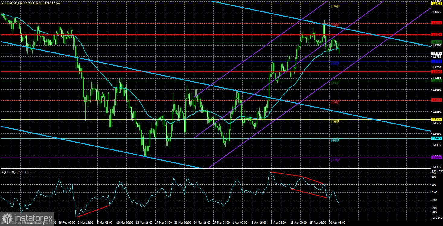 Средняя волатильность валютной пары EUR/USD за последние 5 торговых дней по состоянию на 22 апреля составляет 59 пунктов и характеризуется, как «средняя». Мы ожидаем движение пары между уровнями 1,1686 и 1,1804 в среду. Старший канал линейной регрессии развернулся вниз, что указывает на смену тренда на нисходящий. Однако фактически сейчас может возобновиться восходящий тренд 2025 года. Индикатор CCI заходил в область перекупленности и сформировал «медвежью» дивергенцию, что предупредило о нисходящем откате.