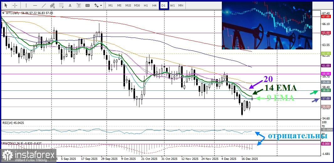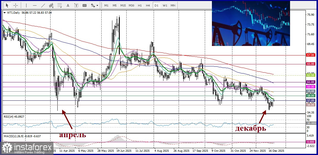 22.12.2025 12:16Нефть марки WTI - West Texas Intermediate начала новую торговую неделю оптимистично, достигнув круглого уровня $57,00. Однако внутридневной рост вызывает сомнения, так как отсутствует убедительная бычья динамика на фоне сочетания разногласий между факторами, оказывающими влияние на рынок.